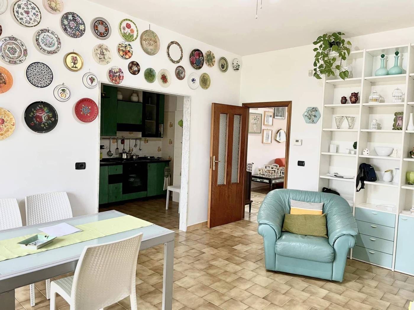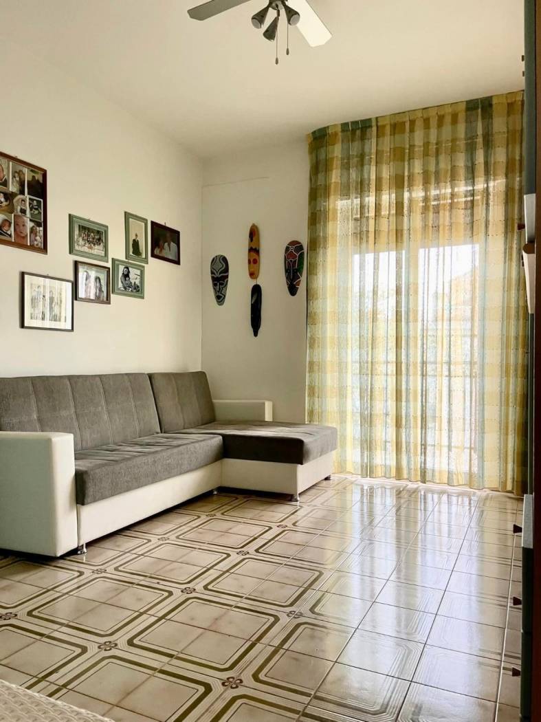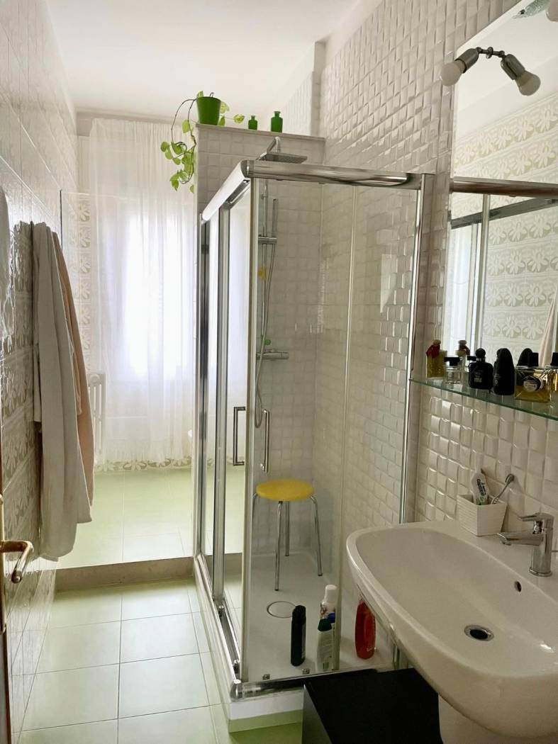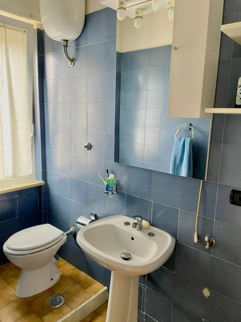 Luminoso ed ampio appartamento abitabile mq 135 al primo piano senza ascensore, zona via Acquaviva, così composto : Ingresso su corridoio, soggiorno, cucina/sala pranzo con cucinotto, doppi servizi, due camere da letto e ripostiglio. Ampio box auto al piano seminterrato di mq 60 + tavernetta. Doppio affaccio con quadrupli balconi. Termoautonomo.
